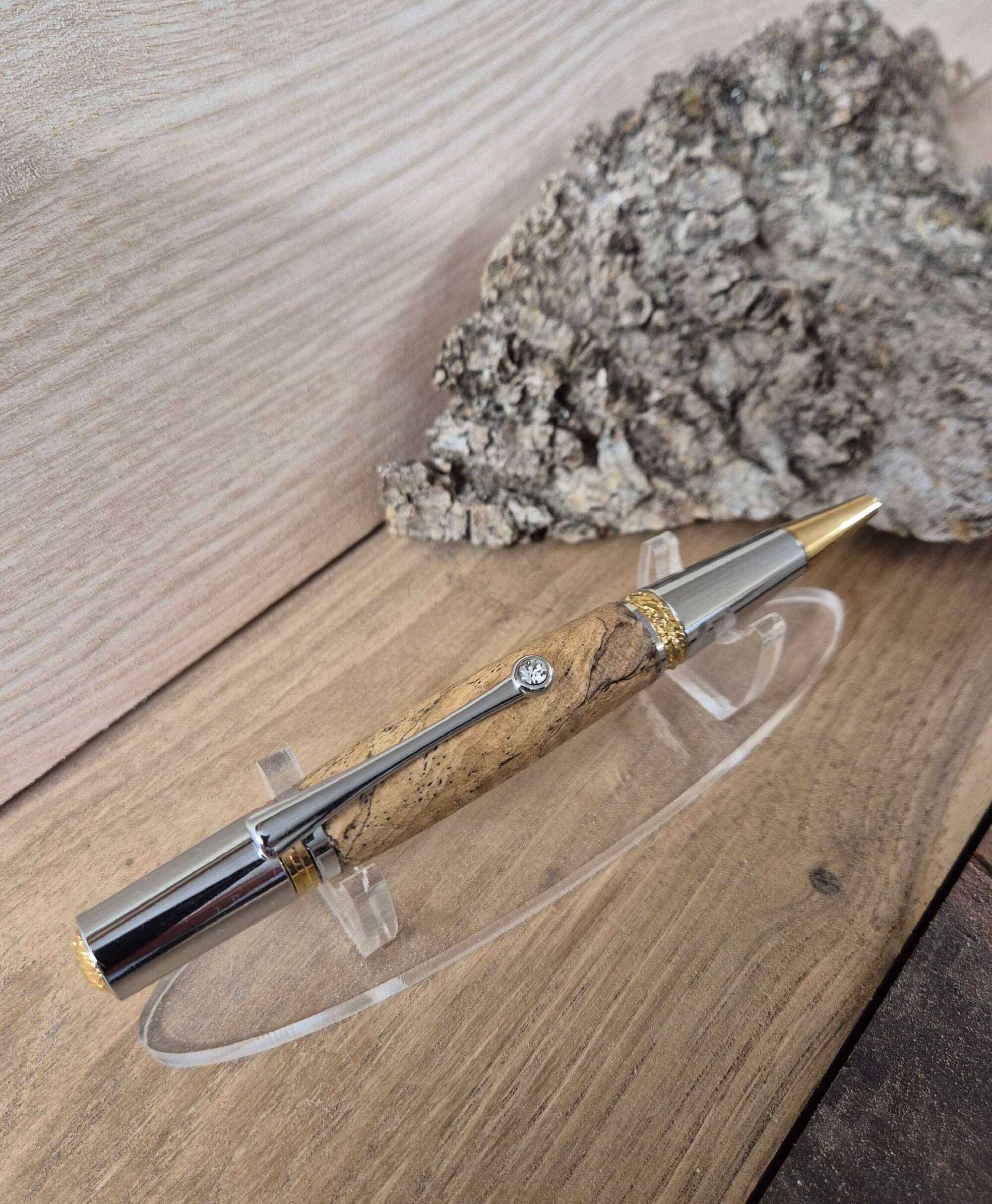 Stylo bille de type Parker, tourné dans du noyer blanc échauffé. Finition plaquée or avec cristal de Swarovski sur le clip.